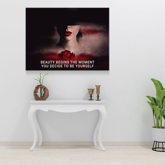 Beauty Begins The Moment You Decide To Be Yourself Canvas Wall Art, Motivational Decor, Inspirational Decor, Red Rose, Woman Boss