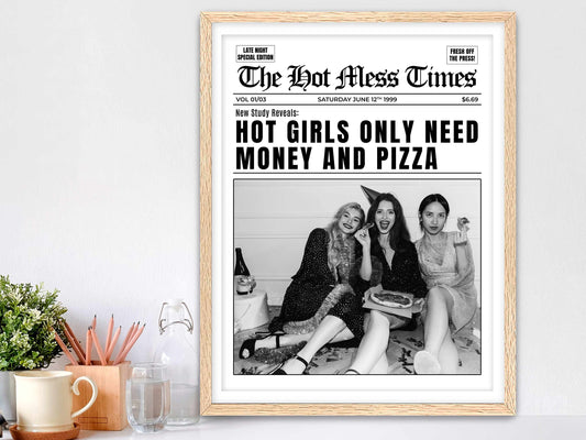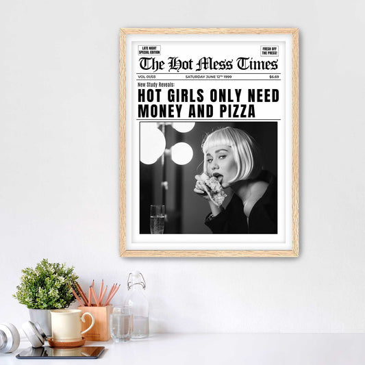 Hot Girls Only Need Money And Pizza Framed Fine Art Print, Feminist Attitude, Black & White Female Vintage Print