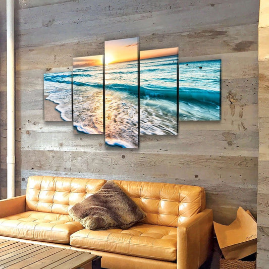 Sunset White Beach Canvas Wall Art, Seascape, 5-Piece Wall Art Set, Large Wall Art, Extra Large Decor, Blue Sea