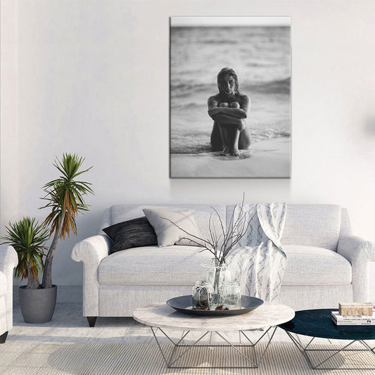 Woman On The Seashore Canvas Wall Art, Woman Beach Print, Black and White Female Print, Woman Water Print, Vintage Print, Fashion Art