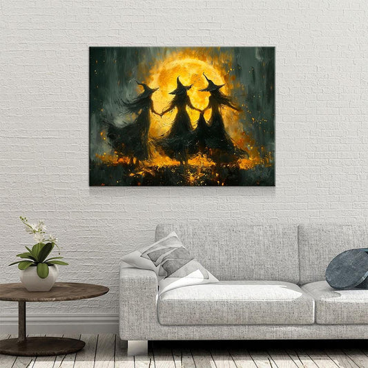 Witches Dancing Around The Fire Canvas Wall Art, Gothic Decor, Halloween Decor, Halloween Hanging, Witch Decor, Pagan Art Print, Hallows Eve