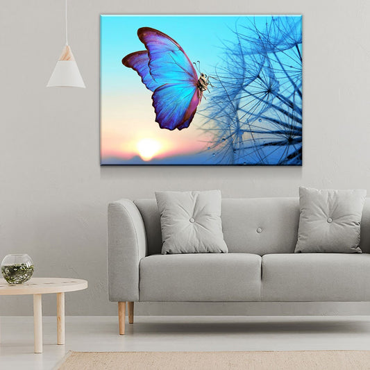 Blue Butterfly Canvas Wall Art, Butterfly Decor, Dandelion Canvas Wall art, Butterfly Sunset