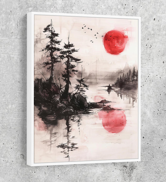 Japandi Canvas Wall Art, Japandi Art, Japanese Wall Art, Japandi Decor, Japandi Zen Wall Art, Watercolor Style, Red Sun On Water