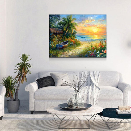 Boat on Tropical Beach Canvas Wall Art, Ocean Beach With Coconut Tree, Boat And Beach Hut, Tropical Decor, Beach House, Coastal Decor