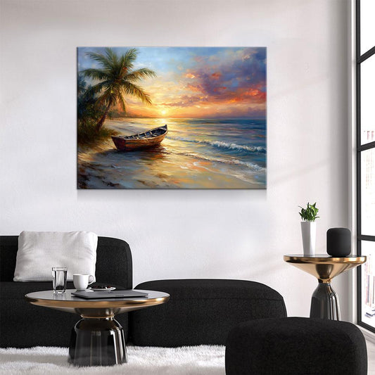Tropical Beach Sunset Canvas Wall Art, Ocean Beach Boat, Tropical Decor, Beach House, Coastal Decor, Ocean Sunset, Tropical Island Beach