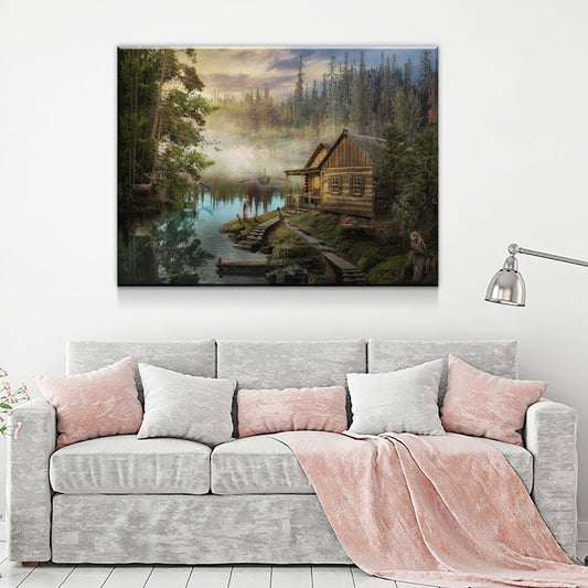 Cabin On The Lake Canvas Wall Art, Forest Cabin, Deer, Owl Decor, Hiking, Fishing Decor, Cabin Decor, Wilderness Decor