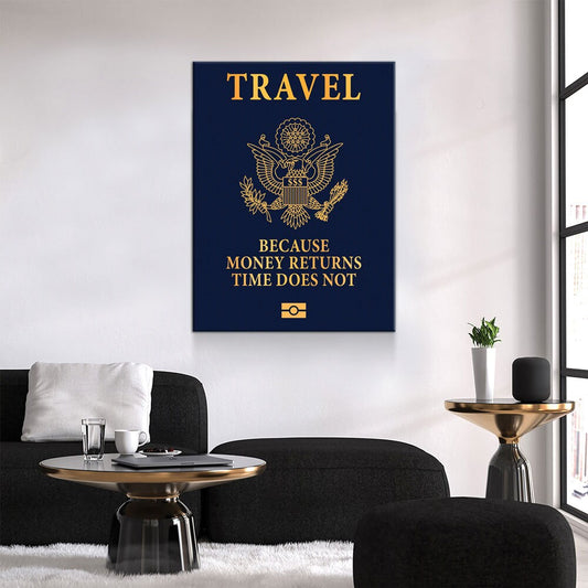 Travel Passport Canvas Wall Art, Because Money Returns Time Does Not, Office Decor, Motivational Decor, Success Quote