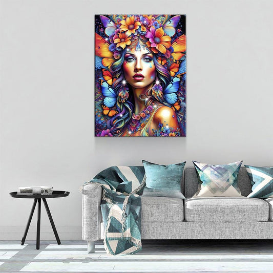 Hippie Girl Canvas Wall Art, Abstract Hippie Girl Wall Hanging, Girl With Butterflies, Flowers In Girls Hair, Vibrant Colors Wall Art